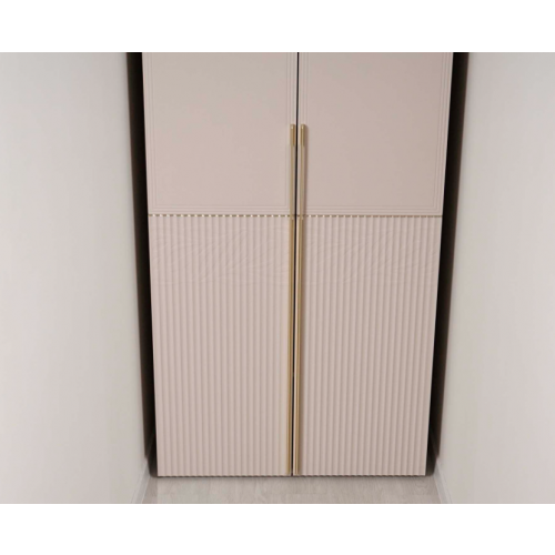 • Металлическая пластина на фасаде толщиной 5 мм проходит обработку по собственной технологии покрытия, которая придает ей изысканный оттенок «сатинового золота». Она гармонично сочетается с цветом фурнитуры и повторяет геометрию вертикальных реек.