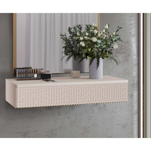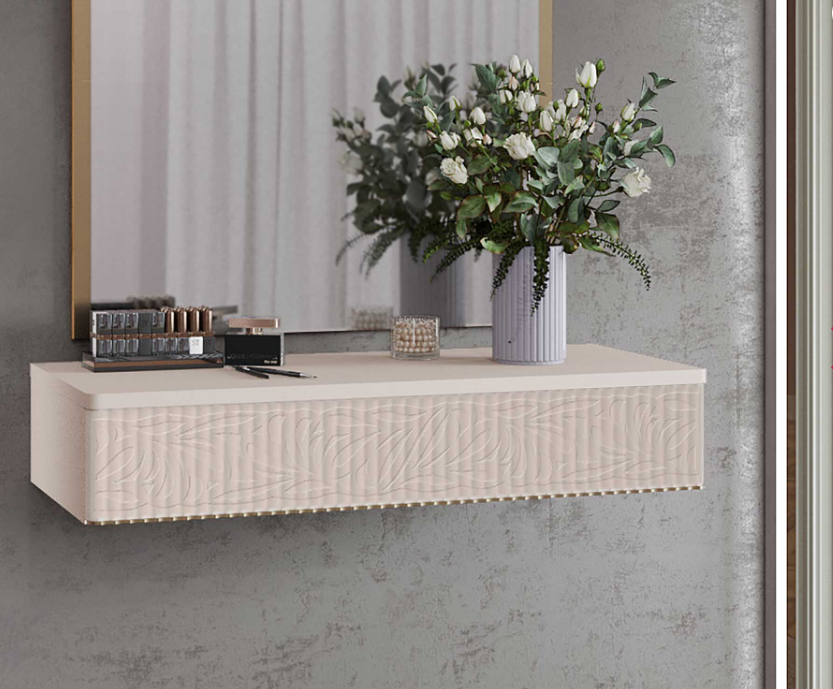 Туалетный столик-консоль «Флоренция 904.15» является частью модульной программы «Флоренция». Спальня «Флоренция» – это образец изящности и современной роскоши. Нежный цвет «Кашемир» создает светлую и теплую основу в интерьере, которая наполняет пространство спокойствием и гармонией. Оригинальные элементы в цвете «сатиновое золото», элегантная фрезеровка и изящный дизайнерский рисунок подчеркивают утонченный дизайн коллекции.