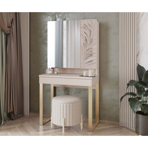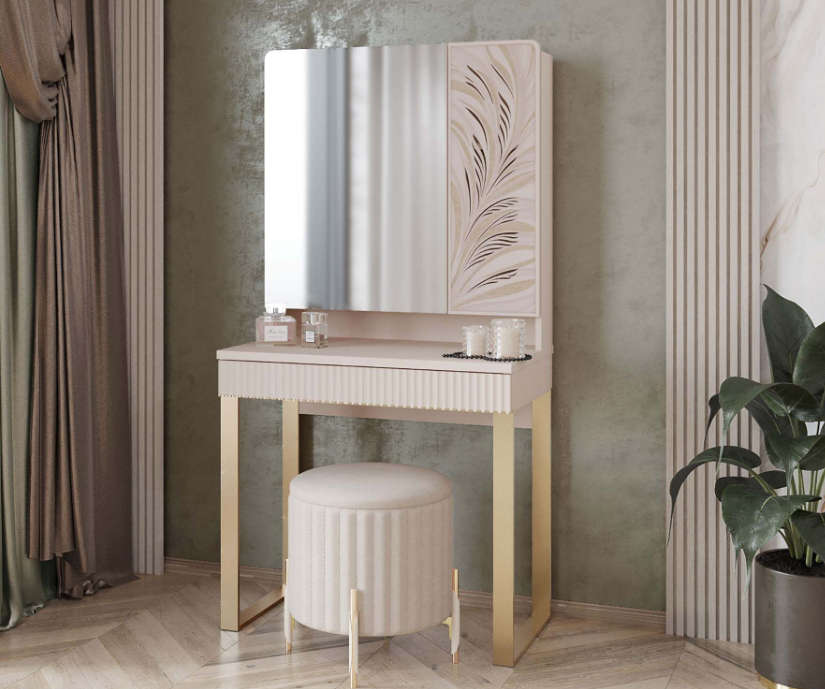 Туалетный столик «Флоренция 904.30» является частью модульной программы «Флоренция». Спальня «Флоренция» – это образец изящности и современной роскоши. Нежный цвет «Кашемир» создает светлую и теплую основу в интерьере, которая наполняет пространство спокойствием и гармонией. Оригинальные элементы в цвете «сатиновое золото» и элегантная фрезеровка подчеркивают утонченный дизайн коллекции.