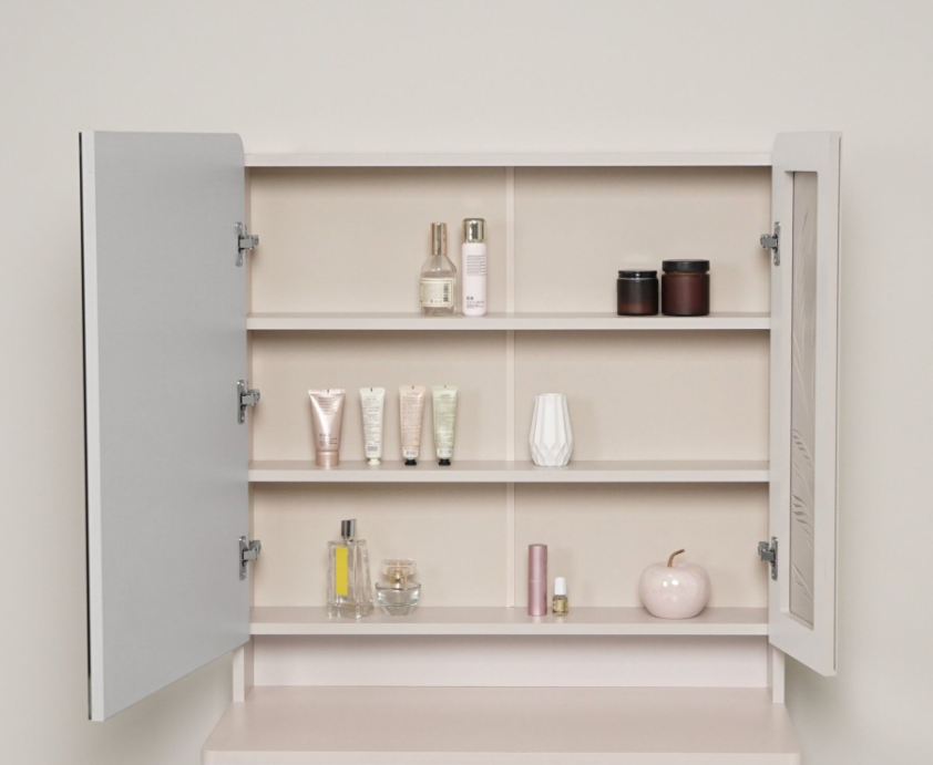 • Полки за дверцами помогут организовать хранение необходимых мелочей.
