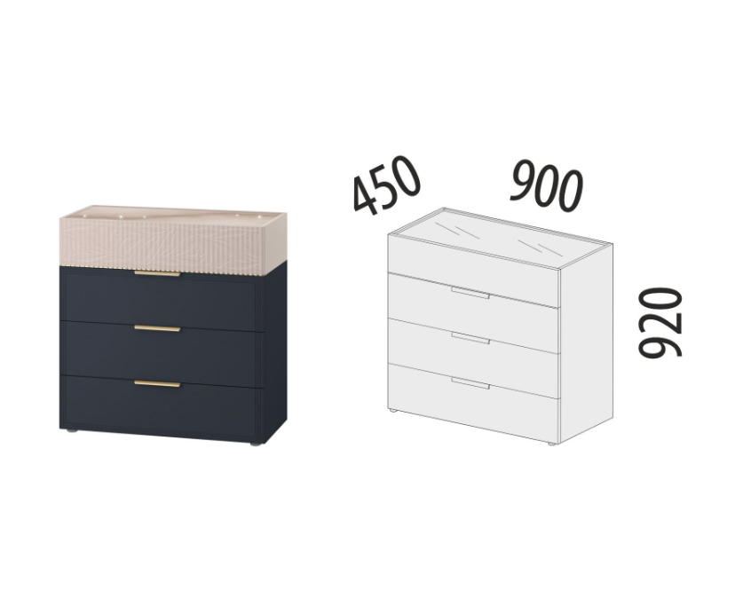 • Фасады ящиков выполнены из МДФ толщиной 18 мм, корпус – из ЛДСП толщиной 16 мм, топ комода – из ЛДСП 22 мм.