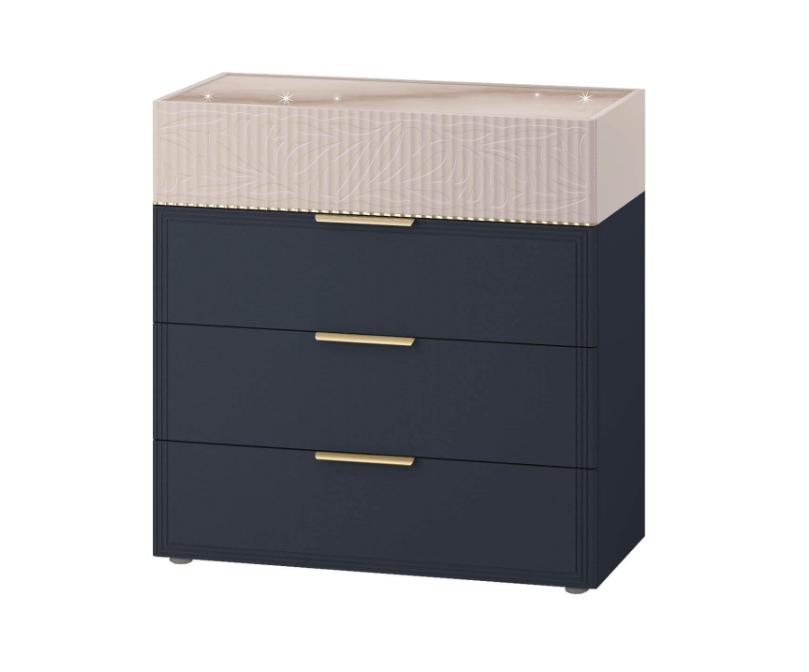 • Стеклянный топ комода декорирован дизайнерским рисунком «Мрамор». Легкое мерцание глиттера придает поверхности глубину и добавляет в интерьер нотку роскоши.
