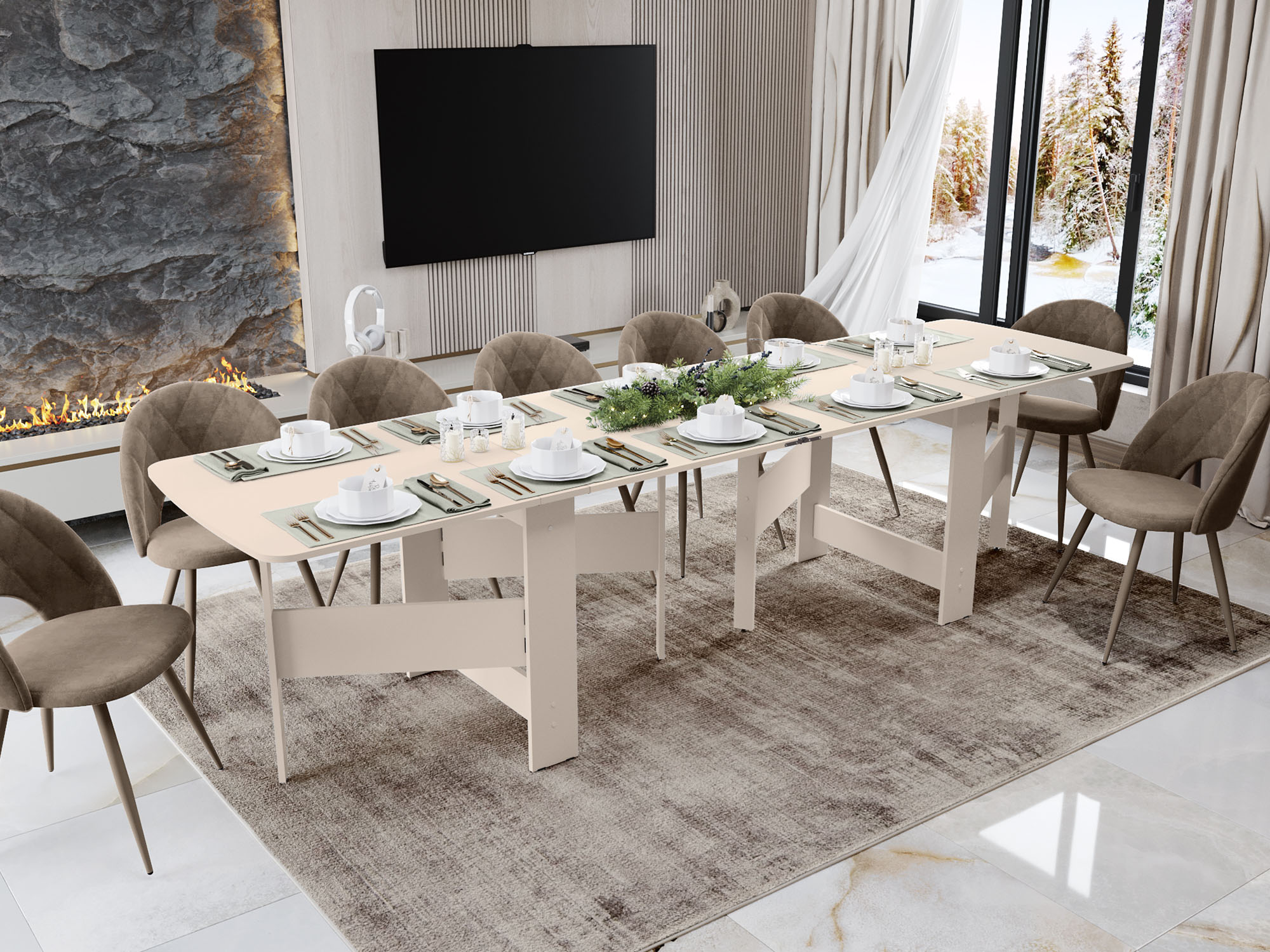 «Колибри-13» – удобный и функциональный стол-книжка за считанные минуты превращается из узкой тумбы в полноценную обеденную зону, где можно разместить до 14 человек. Цветовое решение «Кашемир/Белый песок» добавляет изысканности и тепла. Нежные, приглушенные оттенки идеально гармонируют друг с другом, создавая атмосферу уюта и спокойствия. Такой стол станет настоящим украшением вашей кухни, гостиной или столовой.