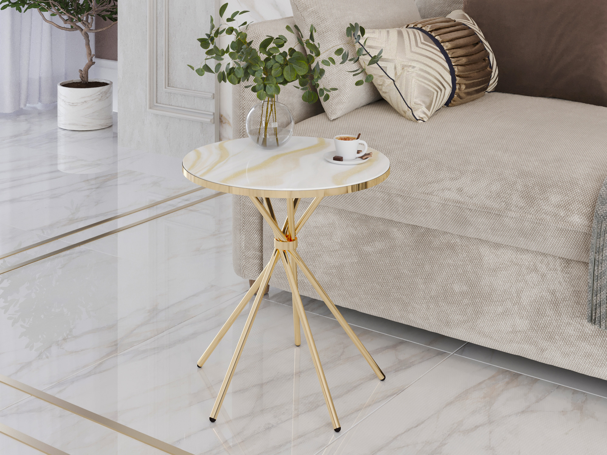 Металлические интерьерные опоры в цвете «глянцевое золото» смотрятся эффектно и дорого и добавляют интерьеру визуальной легкости.
