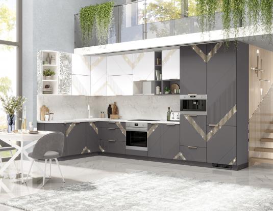 Эффектная фрезеровка с объемным 3D-рисунком и россыпью глиттера подчеркивает эксклюзивный и уникальный вид изделия. Цвет верхних фасадов «Альпийский белый» визуально увеличивает пространство, делая его более светлым и воздушным. Нижние фасады выполнены в насыщенном цвете «Графит», который добавляет кухне глубины и контраста, подчеркивая элегантность дизайна.
