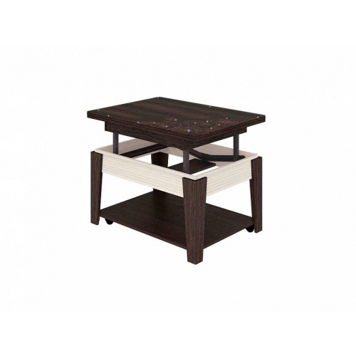 Журнальный стол «Агат 32.10 Венге-Ваниль» имеет 4 варианта трансформации. Механизмы «Подъем на упоры по направляющим» и «Поворот и откидывание столешницы» превращают журнальный стол в обеденный. В сложенном виде размер стола – 95х70 см, в разложенном – 140х95 см; высота стола варьируется от 53 до 77 см.