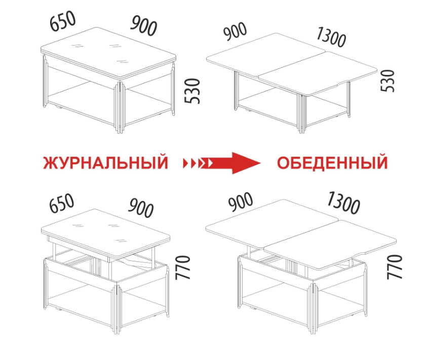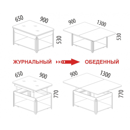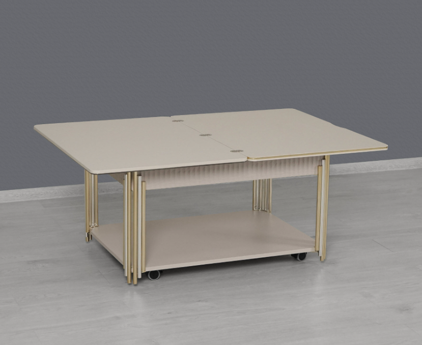 • Благодаря удобному механизму трансформации стол легко и быстро сможет разложить даже хрупкая девушка. Его можно использовать как кофейный столик, а так же как полноценный стол для кухни или для гостиной. Для того чтобы процесс трансформации был ещё удобнее и проще, мы рекомендуем использовать радиусную ручку для раскладывания и стопоры на колесах.