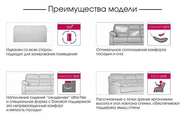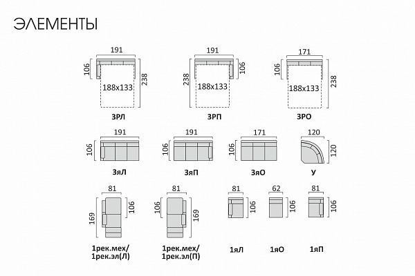 Модульная серия "Рей" состоит из следующих комбинированных изделий: диван прямой с механизмом и без, диван угловой с тумбой, модульный диван, мягкое кресло.