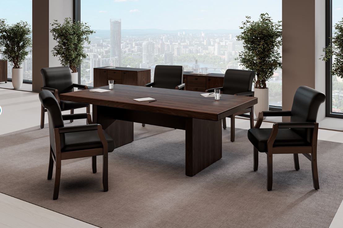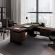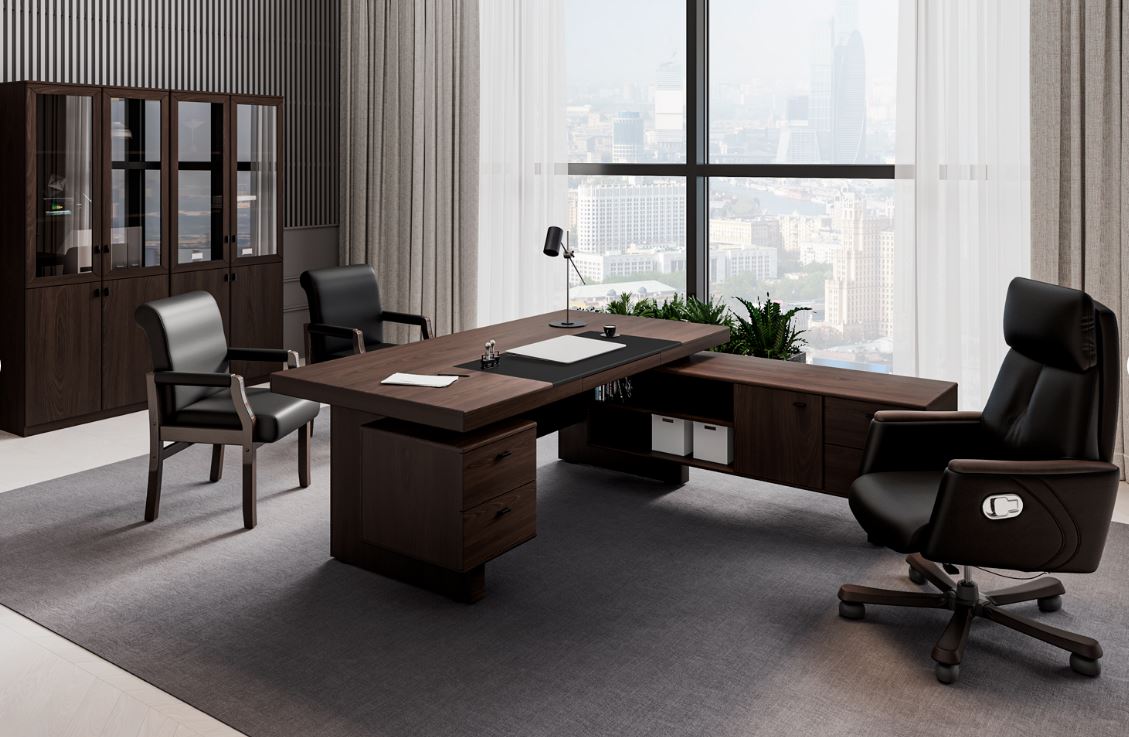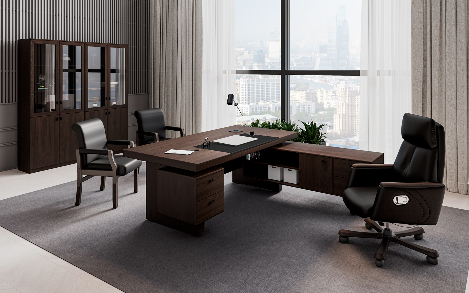 Изысканная простота линий и необычные формы кабинета Sydney подчеркнуты роскошным темным цветом с выраженной древесной текстурой. Столешницы дополнены бюварами из черной экокожи. Благородство минималистичного дизайна и функциональность элементов — основные черты этого кабинета, созданного для руководителя с безупречным вкусом.