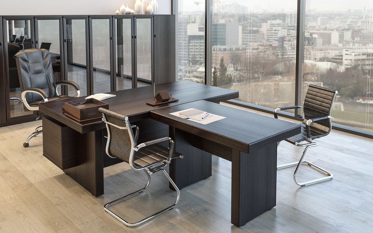 - Столы руководителя снабжены бюваром, обтянутым черной экокожей.