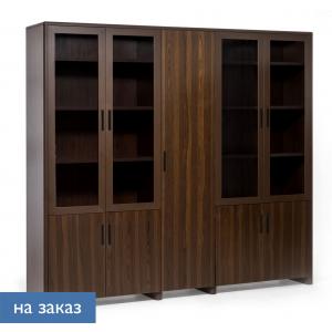 Две верхние стеклянные двери шкафа для бумаг обрамлены в раму из крашенного МДФ толщиной 25 мм. Стекло толщиной 4 мм закаленное тонированное в массе серое. Глухие нижние двери — МДФ толщиной 25 мм + шпон. Как стеклянные, так и деревянные двери укомплектованы петлями с механизмом плавного закрывания. Внутри шкафа 5 книжных полок.